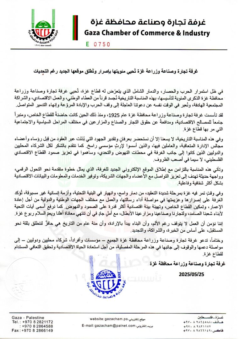 في ظل استمرار الحرب والحصار، والدمار الشامل الذي يتعرّض له قطاع غزة، تُحيي غرفة تجارة وصناعة وزراعة محافظة غزة الذكرى المئوية لتأسيسها، بهذه المناسبة التاريخية نُجسد قرناً من العطاء الوطني، والعمل الاقتصادي، والشراكة المجتمعية الهادفة، ونُعبر في الوقت نفسه عن دعوتنا العاجلة إلى وقف الحرب والإبادة المروّعة وإنهاء التدمير المتواصل.