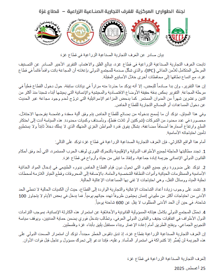 إن الغرف التجارية الصناعية الزراعية بقطاع غزة، إذ تدق ناقوس الخطر مجدداً، تؤكد أن استمرار الصمت الدولي على هذه الجريمة لن يُفسَّر إلا كشراكة في استمرار المأساة. وعليه، فإننا ندعو إلى تحرك مسؤول وعاجل قبل فوات الأوان.